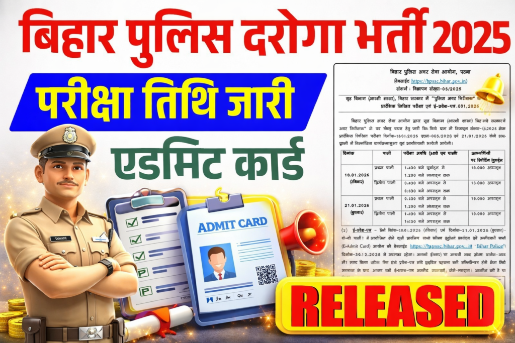 Bihar Police Subordinate Services Commission (BPSSC) has issued the Pre Admit Card on its official website for the Police Sub-Inspector Recruitment Examination 2026 under Advertisement No. 05/2025. The examination is scheduled to be held from 18 to 21 January 2026, and the last date to submit the application form was 26 October 2025. Candidates can check their Exam City details and download the Pre Admit Card by logging into the portal using their Enrollment Number, Registration Number, or Date of Birth. Complete information related to the BPSSC Police Sub-Inspector Exam 2026 is also available on Official and the direct link is provided below.