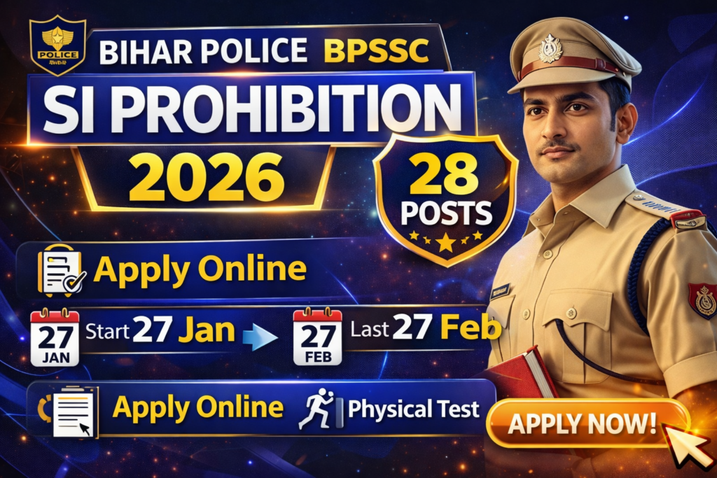 Bihar Police Subordinate Services Commission (BPSSC) has released an official recruitment notification on its official website for the Bihar Police Sub Inspector Prohibition post under Advertisement No. 03/2026. This recruitment drive is being conducted for a total of 78 vacancies. The BPSSC online application process will start from 27 January 2026, and eligible candidates can apply online until 27 February 2026. As per the eligibility criteria, the minimum age limit is 20 years and the maximum age limit is 37 years, calculated as on 01 August 2025. Candidates are advised to carefully check the complete notification, including eligibility conditions, age limit, selection process, and application guidelines, before applying for the Bihar Police BPSSC SI Prohibition Recruitment 2026, the full details of which are provided below.
