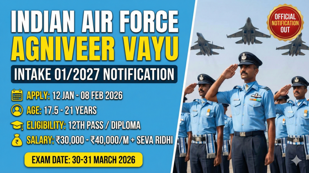 Indian Air Force has released the official notification on its official website for the Airforce Agniveer Vayu Intake 01/2027 Examination 2026 under Advertisement No. 01/2027. The Indian Air Force online application process started on 12 January 2026, and the last date to apply has been extended till 08 February 2026. As per the eligibility criteria, the minimum age limit is 17.5 years and the maximum age limit is 21 years. Candidates are advised to carefully check the complete notification, including eligibility conditions, age limit, selection process, and application instructions, before applying for the Indian Air Force Agniveer Vayu Intake 01/2027 Online Form, the full details of which are provided below.