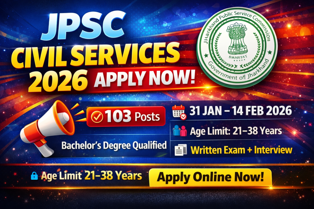Jharkhand Public Service Commission (JPSC) has released the official notification on its official website for the Civil Services Preliminary Examination Recruitment 2026 under Advertisement No. 01/2026. This recruitment process is being conducted for a total of 103 vacancies. The JPSC online application process will start from 31 January 2026, and eligible candidates can submit their applications until 14 February 2026. As per the eligibility criteria, the minimum age limit is 21 years and the maximum age limit is 38 years, calculated as on 01 August 2026. Candidates are advised to carefully check the complete notification, including eligibility conditions, age limit, exam details, and application instructions, before applying for the JPSC Civil Services Pre Recruitment 2026, details of which are provided below.