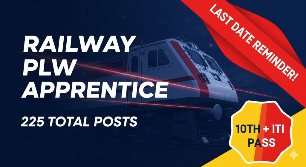 Indian Railways Patiala Locomotive Works (PLW), Patiala ने Railway PLW Apprentice Recruitment 2025 के लिए अपनी Official Website पर Notification जारी की है। यह Recruitment कुल 225 Posts के लिए है। Railway Application Form 1 December 2025 से शुरू हो गए हैं और उम्मीदवार 22 December 2025 तक Apply कर सकते हैं। उम्मीदवार Railway PLW Apprentice Recruitment 2025 से संबंधित All Details Official Website SarkariExam2026 पर भी देख सकते हैं, जो नीचे दिए गए हैं।