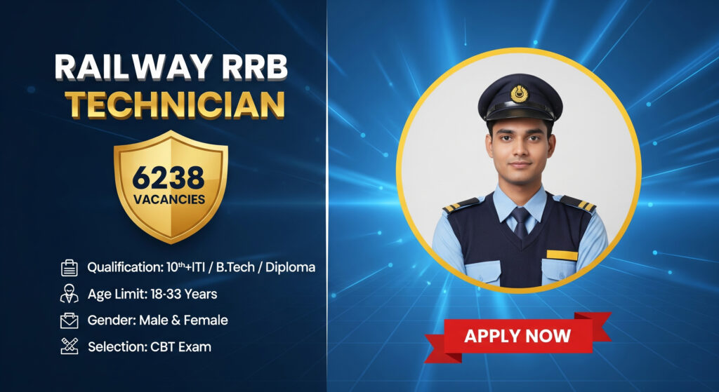 | Railway RRB Technician | 6238 | Candidates Must Have A BE/B.Tech, Engineering Diploma, Or B.Sc. In Engineering. For Technician Gr-III (Open Line, Workshop & PUs), Candidates Must Have Passed Class 10th With An ITI Certificate In The Relevant Trade Or Class 12th With PCM Subjects. |