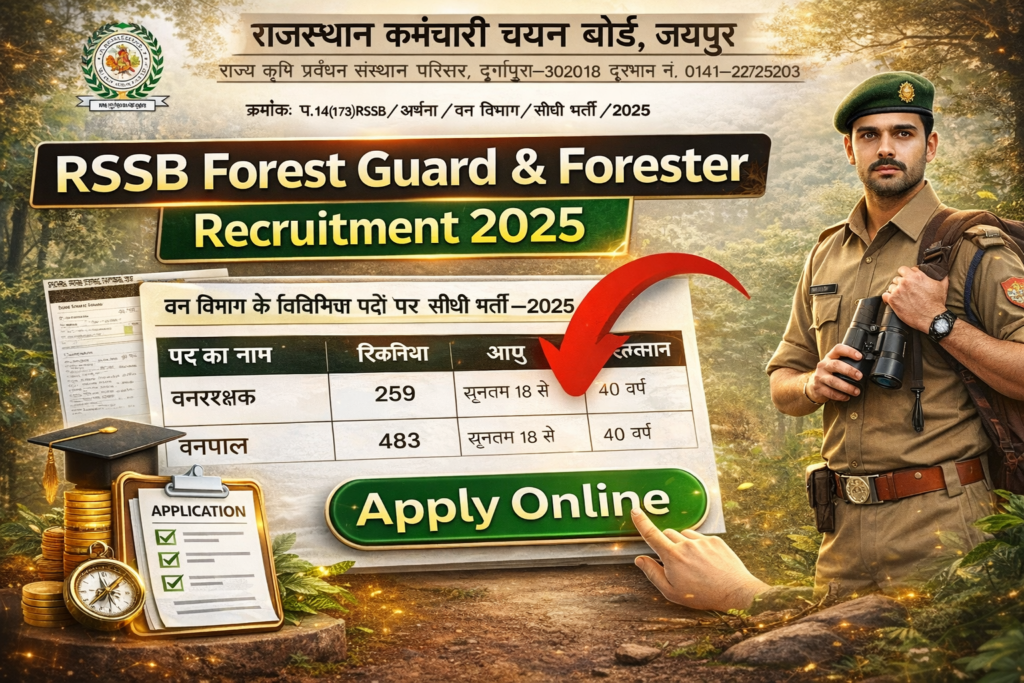 Rajasthan Staff Selection Board (RSSB) has announced a new recruitment notification for Forest Guard, Forester, and Surveyor posts under the Rajasthan Forest Department Recruitment 2025. This recruitment drive is being conducted for a total of 785 vacancies. The RSSB Forest Guard and Forester Online Registration Form 2025 will be started soon through the official website rssb.rajasthan.gov.in. Candidates who are interested in RSSB Forest Guard and Forester Bharti 2025 are advised to carefully read the complete notification before applying and check details related to eligibility criteria, application fee, age limit, salary, selection process, and other important instructions. All official details and the direct link for the RSSB Forest Guard and Forester Online Application Form 2025 are provided below.