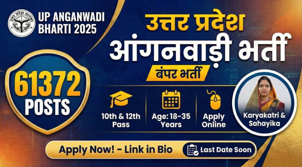 Uttar Pradesh District Program Officer (Uttar Pradesh Government) has released an official recruitment notification on its official website for UP Anganwadi Bharti 2026. This large scale recruitment drive is being conducted for a total of 60,751 vacancies across various districts of Uttar Pradesh. The UP Anganwadi application process started in November 2025, and eligible candidates can apply district wise until January 2026, as per the schedule announced by each district. According to the eligibility criteria, the minimum age limit is 18 years and the maximum age limit is 35 years, calculated as on 01 July 2025. Candidates are advised to carefully check the complete notification, including district wise vacancy details, eligibility conditions, and application instructions, for the UP Anganwadi Bharti Recruitment 2026, which are provided in detail below on Official Website.