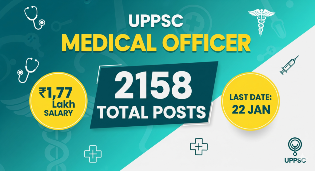 उत्तर प्रदेश लोक सेवा आयोग (UPPSC) ने अपनी Official Website पर Medical Officer और Other Posts Recruitment 2025 के लिए Notification जारी की है। यह Recruitment कुल 2,158 Posts के लिए है। UPPSC Application Form 22 December 2025 से शुरू हो गए हैं और उम्मीदवार 22 January 2026 तक Apply कर सकते हैं। Minimum Age 21 Years और Maximum Age 40 Years है, जो 1 July 2025 तक मान्य होगी। उम्मीदवारों को UPPSC Medical Officer & Other Posts Recruitment 2025 से संबंधित संपूर्ण जानकारी नीचे दी गई है। (Advertisement Number: D-6/E-1/2025)